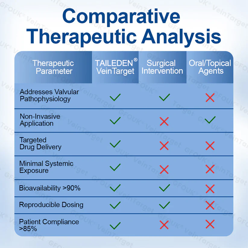 TAILEDEN® VeinTarget representerar det första kommersiellt tillgängliga transdermala fytoterapisystemet som är specifikt utformat för att behandla venös klaffinsufficiens genom lokal botanisk intervention. Till skillnad från systemiska behandlingar som späder ut aktiva föreningar i hela cirkulationssystemet eller topiska appliceringar som inte kan penetrera hudbarriären, säkerställer vårt mikronålsleveranssystem att koncentrerade terapeutiska föreningar når målvävnaden med minimal systemisk exponering.