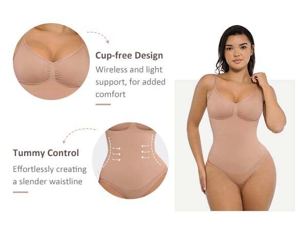 • A thong bodysuit that holds in your core, supports your chest, and cinches your waist.