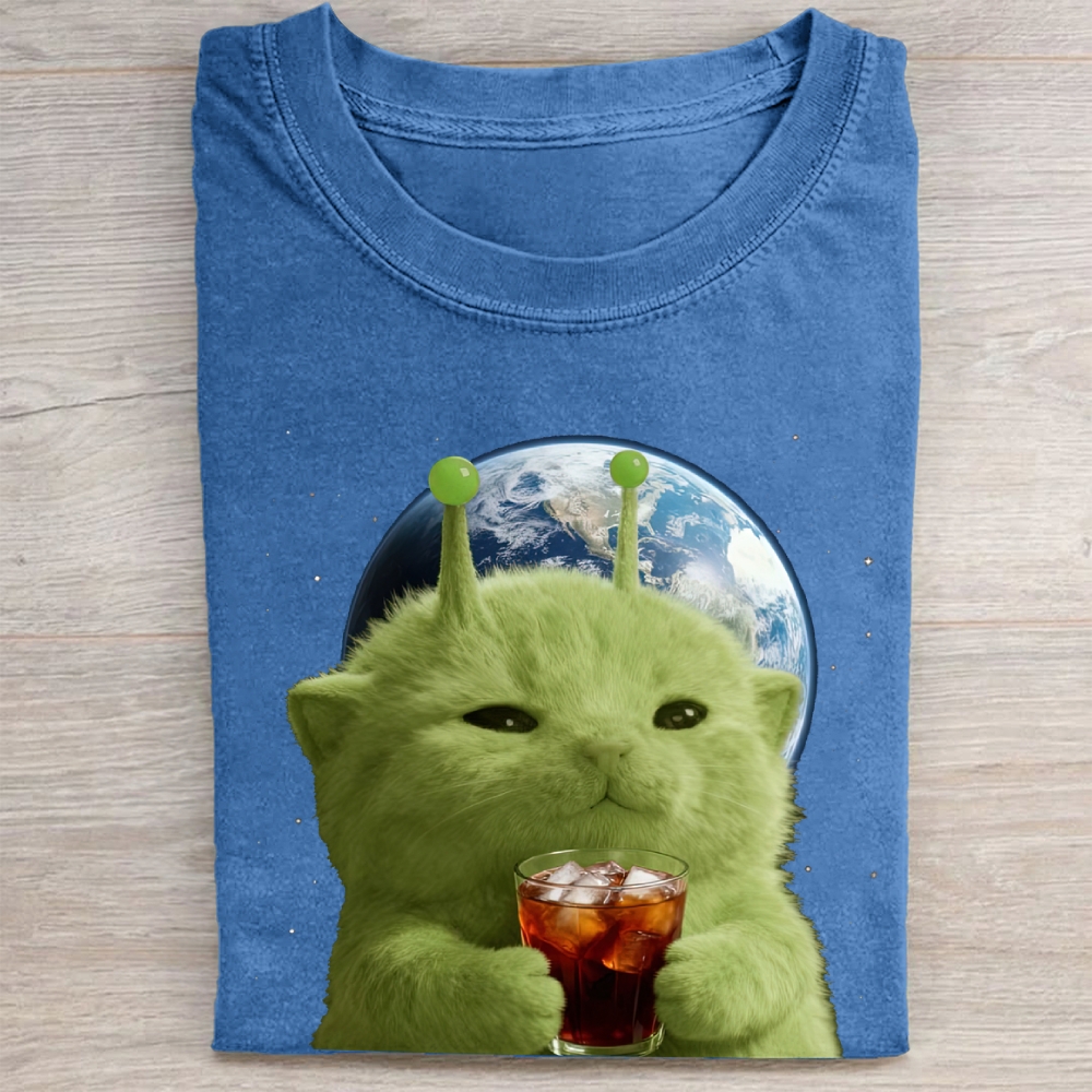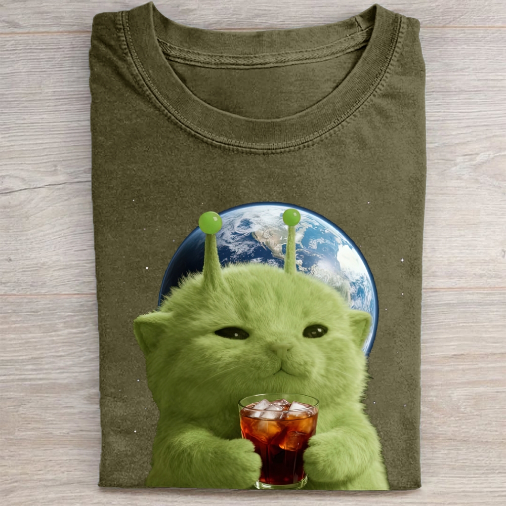 Green Alien Cat Earth Soda Vintage Washed Tee